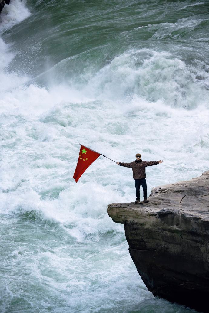 图片中,李现在悬崖边举起国旗,脚下是波涛汹涌的金沙江。粉丝评论“真的好勇敢、好自由”“壮哉”。